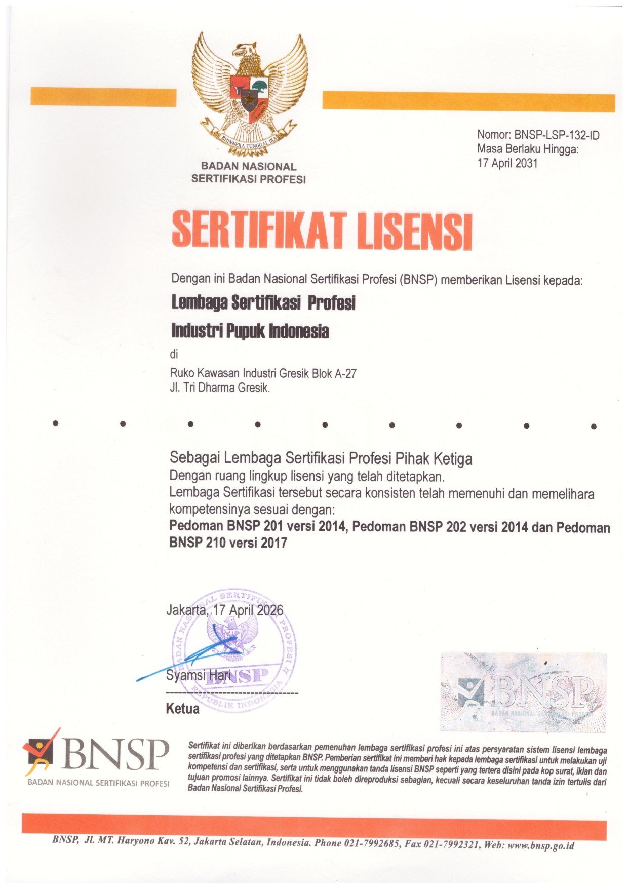 | 11 | Uji Sertifikasi Kompetensi Bidang Laboratorium Skema Analisis Kimia IndustriDiklat PT Petrokimia Gresik ( 01 Oktober 2025 - 03 Oktober 2025 ) |